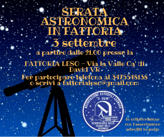 Il 3 settembre alle 21.00 presso la FATTORIA LESO, sarà allestito un punto di osservazione astronomica.