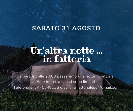 Sabato 31 agosto, a grande richiesta, sempre a partire dalle 20.00, faremo un’altra notte in Fattoria. Prepareremo le tende, ceneremo e dormiremo sotto le stelle.