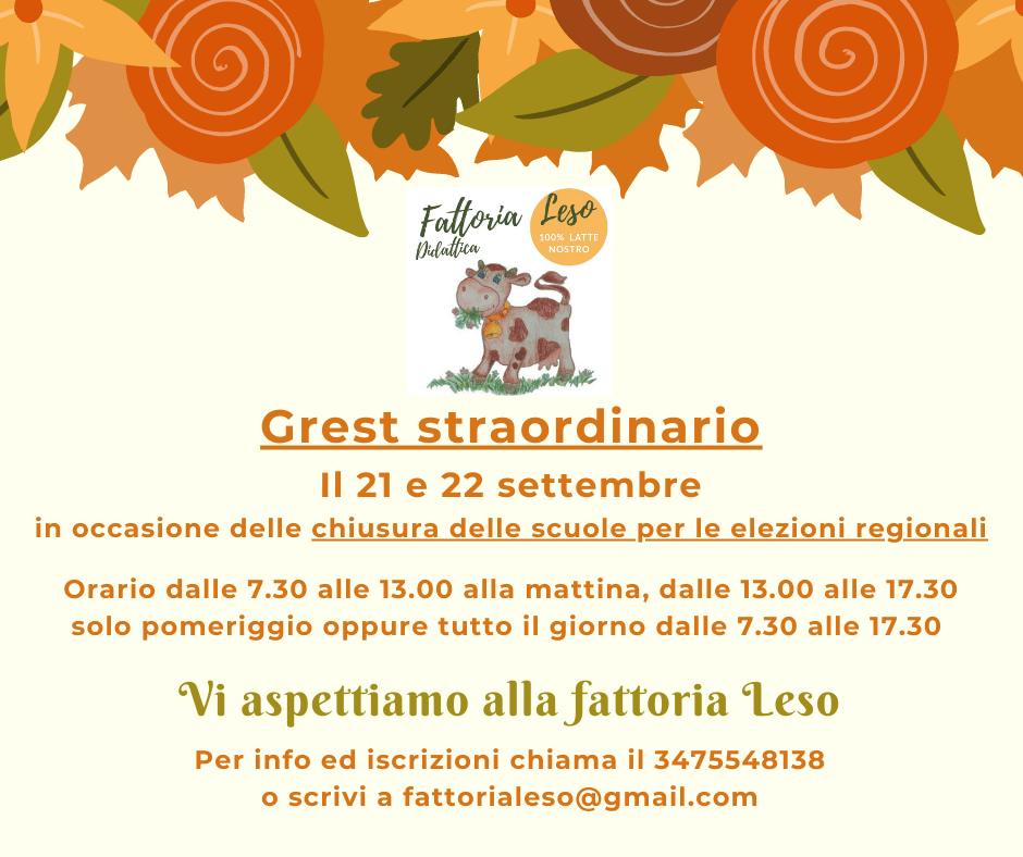 Il 21 e 22 settembre in occasione della chiusura delle scuole per le elezioni regionali, in fattoria faremo un grest straordinario.
