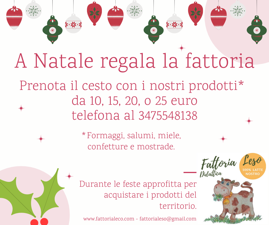 Posted on 19/11/2020 di AdminA Natale regala la Fattoria Durante le feste approfitta per acquistare i prodotti del territorio. Prenota il cesto con i nostri prodotti, telefona al 3475548138. Condividi: Fai clic per condividere su Facebook (Si apre in una nuova finestra) Facebook Fai clic per condividere su WhatsApp (Si apre in una nuova finestra) WhatsApp Fai clic qui per condividere su LinkedIn (Si apre in una nuova finestra) LinkedIn Fai clic per condividere su Telegram (Si apre in una nuova finestra) Telegram Mi piace Caricamento...