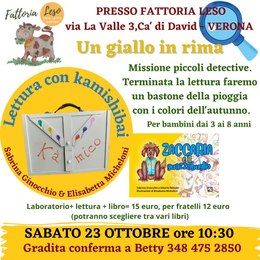 Posted on 18/10/202118/10/2021 di AdminUN GIALLO IN RIMA Sabato mattina, 23 ottobre, alle ore 10.30 avremo ospiti Sabrina ed Elisabetta che leggeranno una bellissima storia e poi faranno un lavoretto con i bambini. Condividi: Fai clic per condividere su Facebook (Si apre in una nuova finestra) Facebook Fai clic per condividere su WhatsApp (Si apre in una nuova finestra) WhatsApp Fai clic qui per condividere su LinkedIn (Si apre in una nuova finestra) LinkedIn Fai clic per condividere su Telegram (Si apre in una nuova finestra) Telegram Mi piace Caricamento...