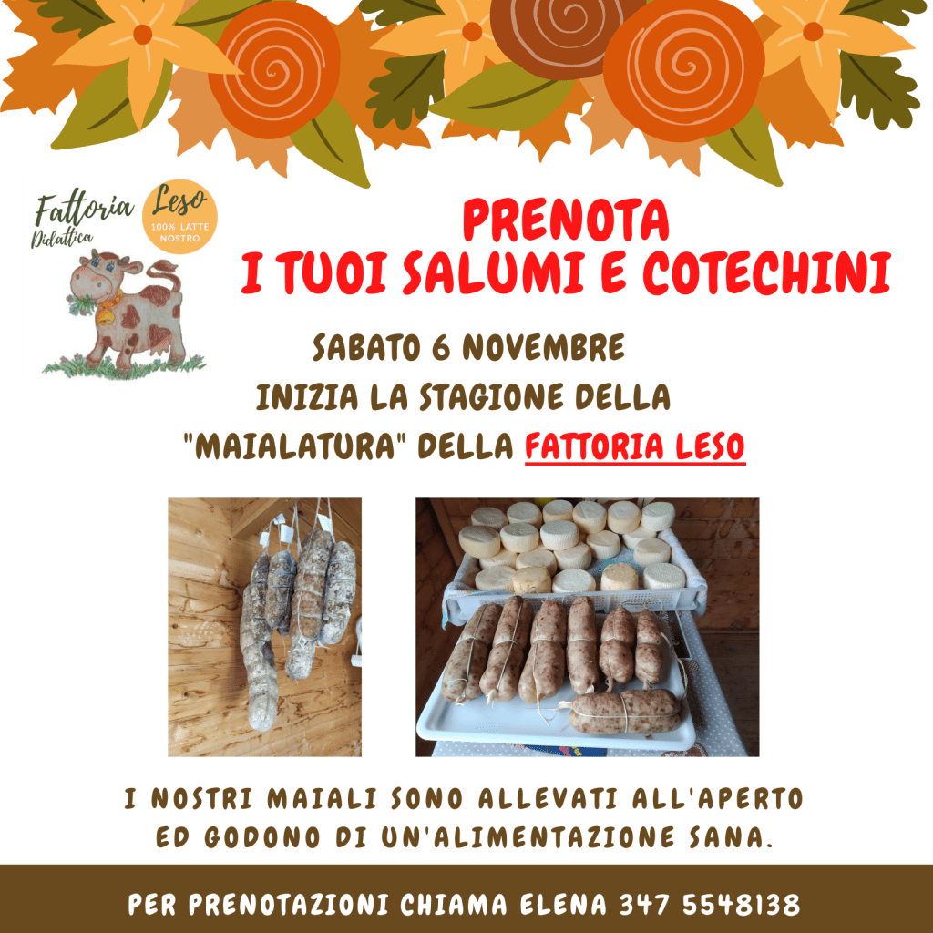 Posted on 04/11/2021 di AdminPrenota i tuoi salumi e cotechini Sabato 6 novembre inizia la stagione della “Maialatura“.Per prenotazioni chiama Elena al 3475548138. Condividi: Fai clic per condividere su Facebook (Si apre in una nuova finestra) Facebook Fai clic per condividere su WhatsApp (Si apre in una nuova finestra) WhatsApp Fai clic qui per condividere su LinkedIn (Si apre in una nuova finestra) LinkedIn Fai clic per condividere su Telegram (Si apre in una nuova finestra) Telegram Mi piace Caricamento...