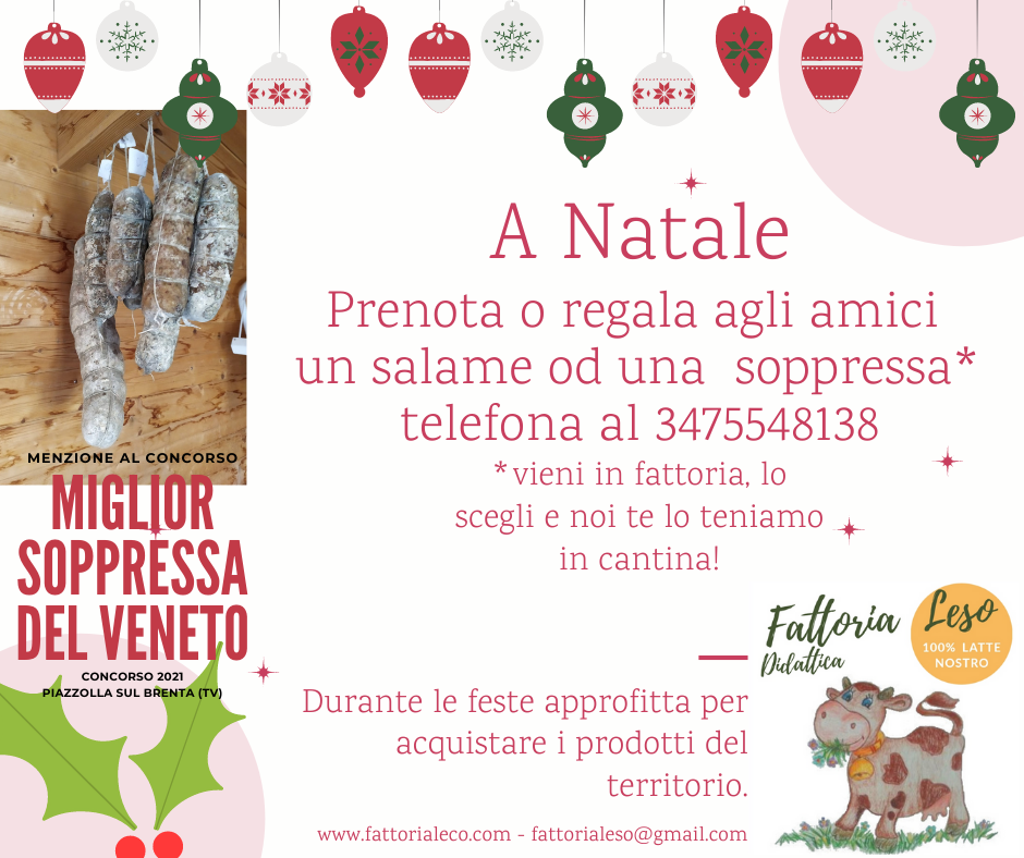 Posted on 14/12/2021 di AdminA Natale regala i prodotti della Fattoria Leso Per Natale prenota o regala agli amici un salame od una soppressa (*)telefona al 3475548138. Durante le feste approfitta per acquistare i prodotti del territorio. (*) vieni in fattoria, lo scegli e noi te lo teniamo in cantina! Condividi: Fai clic per condividere su Facebook (Si apre in una nuova finestra) Facebook Fai clic per condividere su WhatsApp (Si apre in una nuova finestra) WhatsApp Fai clic qui per condividere su LinkedIn (Si apre in una nuova finestra) LinkedIn Fai clic per condividere su Telegram (Si apre in una nuova finestra) Telegram Mi piace Caricamento...