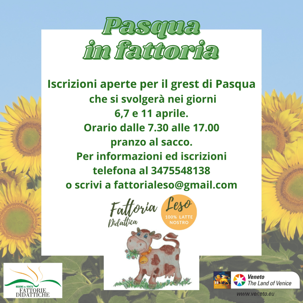 Posted on 20/03/2023 di AdminPasqua in Fattoria Iscrizioni aperte per il grest di Pasqua che si svolgerà nei giorni 6,7 e 11 aprile.Orario dalle 7.30 alle 17.00Pranzo al sacco.Per informazioni ed iscrizionitelefona al 3475548138 o scrivi a fattorialeso@gmail.com Condividi: Fai clic per condividere su Facebook (Si apre in una nuova finestra) Facebook Fai clic per condividere su WhatsApp (Si apre in una nuova finestra) WhatsApp Fai clic qui per condividere su LinkedIn (Si apre in una nuova finestra) LinkedIn Fai clic per condividere su Telegram (Si apre in una nuova finestra) Telegram Mi piace Caricamento...
