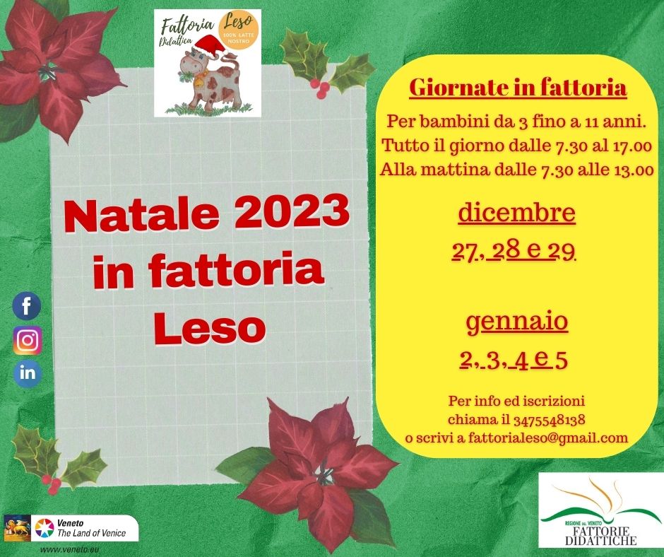 Posted on 13/11/2023 di AdminNatale 2023 in fattoria Leso Giornate in fattoriaPer bambini da 3 fino a 11 anni.Tutto il giorno dalle 7.30 al 17.00Alla mattina dalle 7.30 alle 13.00dicembre27, 28 e 29gennaio2, 3, 4 e 5 Condividi: Fai clic per condividere su Facebook (Si apre in una nuova finestra) Facebook Fai clic per condividere su WhatsApp (Si apre in una nuova finestra) WhatsApp Fai clic qui per condividere su LinkedIn (Si apre in una nuova finestra) LinkedIn Fai clic per condividere su Telegram (Si apre in una nuova finestra) Telegram Mi piace Caricamento...