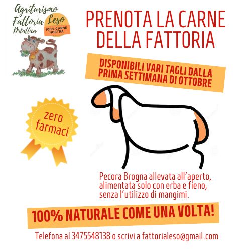 Posted on 01/09/2024 di AdminPrenota la carne della fattoria Pecora Brogna allevata all’aperto, alimentata solo con erba e fieno, senza l’utilizzo di mangimi.Disponibili vari tagli dalla prima settimana di ottobreTelefona al 3475548138 o scrivi a fattorialeso@gmail.com Condividi: Fai clic per condividere su Facebook (Si apre in una nuova finestra) Facebook Fai clic per condividere su WhatsApp (Si apre in una nuova finestra) WhatsApp Fai clic qui per condividere su LinkedIn (Si apre in una nuova finestra) LinkedIn Fai clic per condividere su Telegram (Si apre in una nuova finestra) Telegram Mi piace Caricamento...