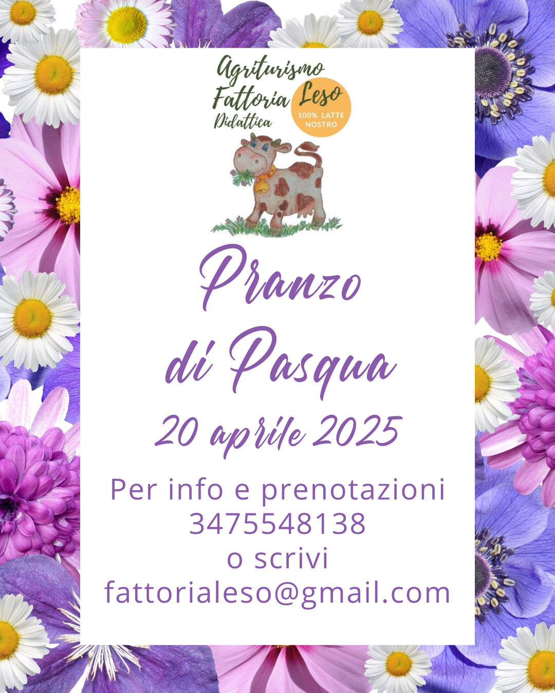 Posted on 16/04/202516/04/2025 di AdminPranzo di Pasqua in fattoria Domenica 20 aprile 2025 Per info e prenotazioni chiamare il 3475548138 o scrivere a fattorialeso@gmail.com Condividi: Fai clic per condividere su Facebook (Si apre in una nuova finestra) Facebook Fai clic per condividere su WhatsApp (Si apre in una nuova finestra) WhatsApp Fai clic qui per condividere su LinkedIn (Si apre in una nuova finestra) LinkedIn Fai clic per condividere su Telegram (Si apre in una nuova finestra) Telegram Mi piace Caricamento...