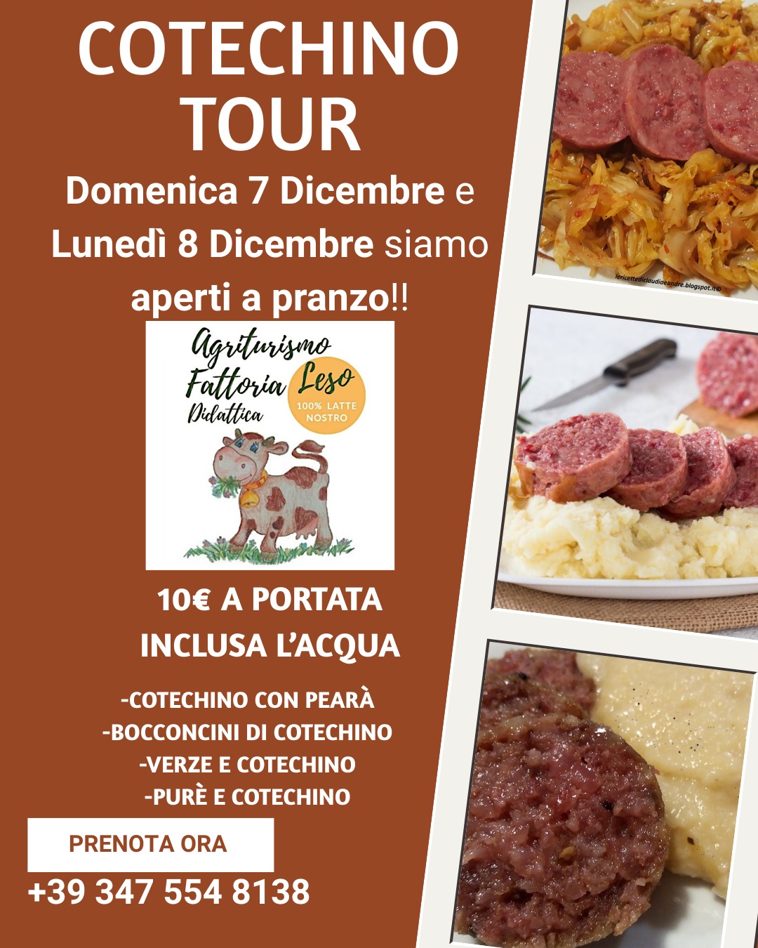 Posted on 03/12/202503/12/2025 di AdminCotechino Tour Domenica 7 dicembre e lunedì 8 dicembre siamo aperti a pranzo. 10 € a portata inclusa l’acqua.– cotechino con pearà– bocconcini di cotechino– verze e cotechino– purè e cotechino Prenota ora al 3475548138 Condividi: Fai clic per condividere su Facebook (Si apre in una nuova finestra) Facebook Fai clic per condividere su WhatsApp (Si apre in una nuova finestra) WhatsApp Fai clic qui per condividere su LinkedIn (Si apre in una nuova finestra) LinkedIn Fai clic per condividere su Telegram (Si apre in una nuova finestra) Telegram Mi piace Caricamento...